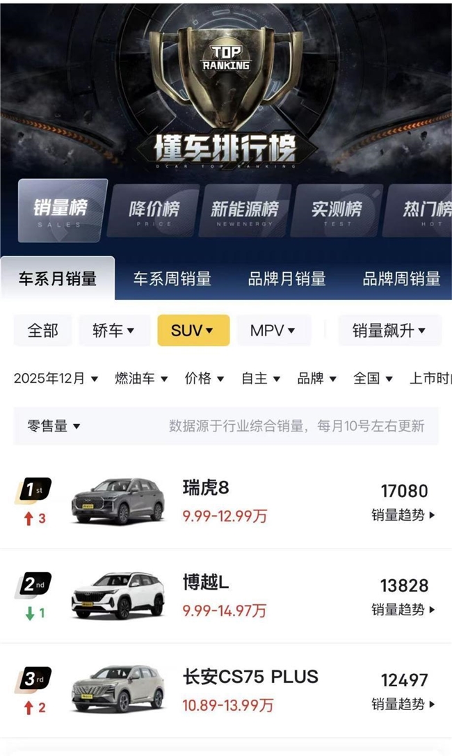 近日,奇瑞瑞虎8交出亮眼答卷:2025年12月销售17080台,强势登顶自主品牌燃油车销量冠军宝座,更连续10个月蝉联自主品牌燃油中型SUV销量榜首。在新能源浪潮不断冲击行业格局的当下,瑞虎8家族凭借持续的产品迭代与技术积淀,展现出“中国新燃油”的强劲韧性与进化动能。
